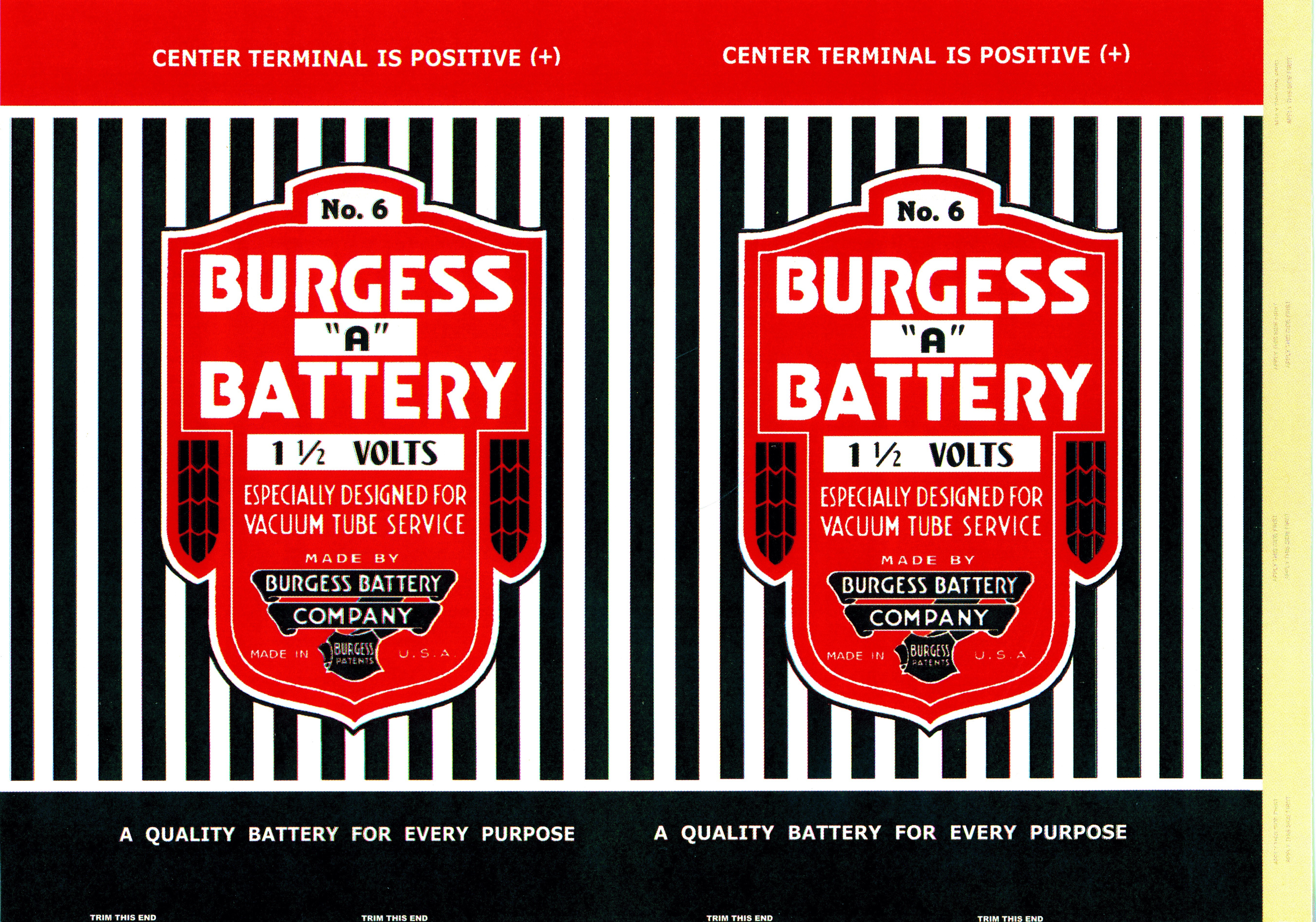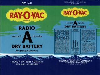The most common type of A batteries is the No.6 cylindrical battery. It is a 1 1/2 volt battery which will normally be wired in series of 3 or 4 to acquire the desired voltage (4.5 or 6 volts). They are 6 1/8 inches long, and 2 1/2 inches in diameter. The tubes I use are made of acrylic, but others have used postal mailing tubes (although the diameter is a little larger - this can be a factor in sets that have close battery quarters).