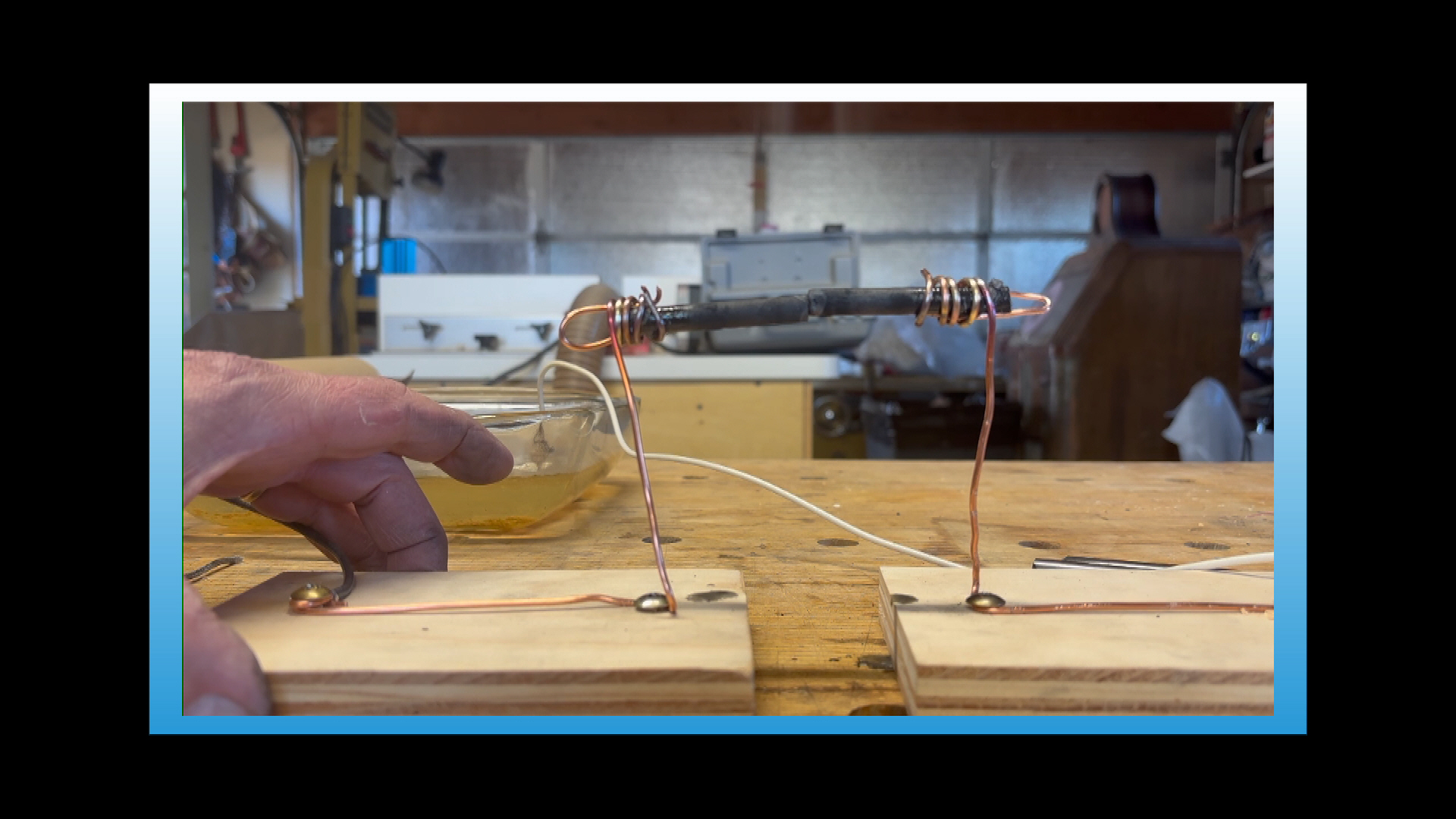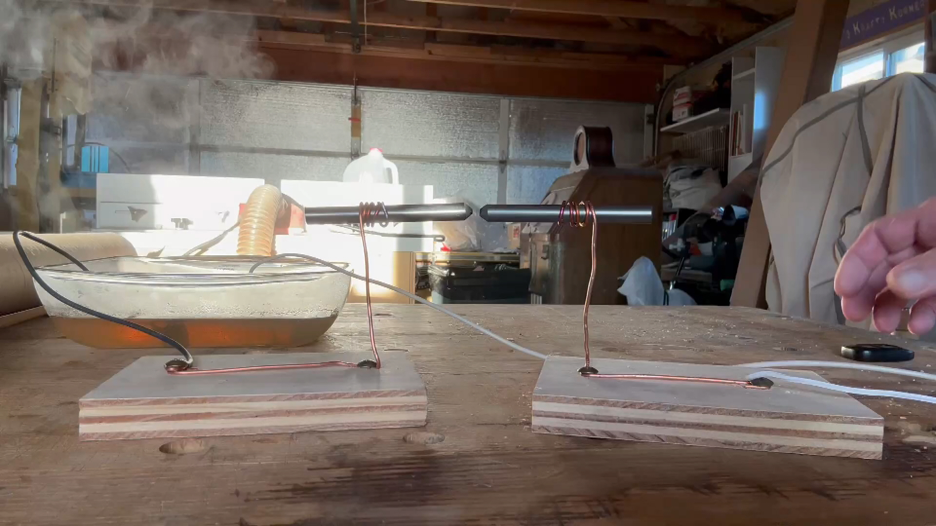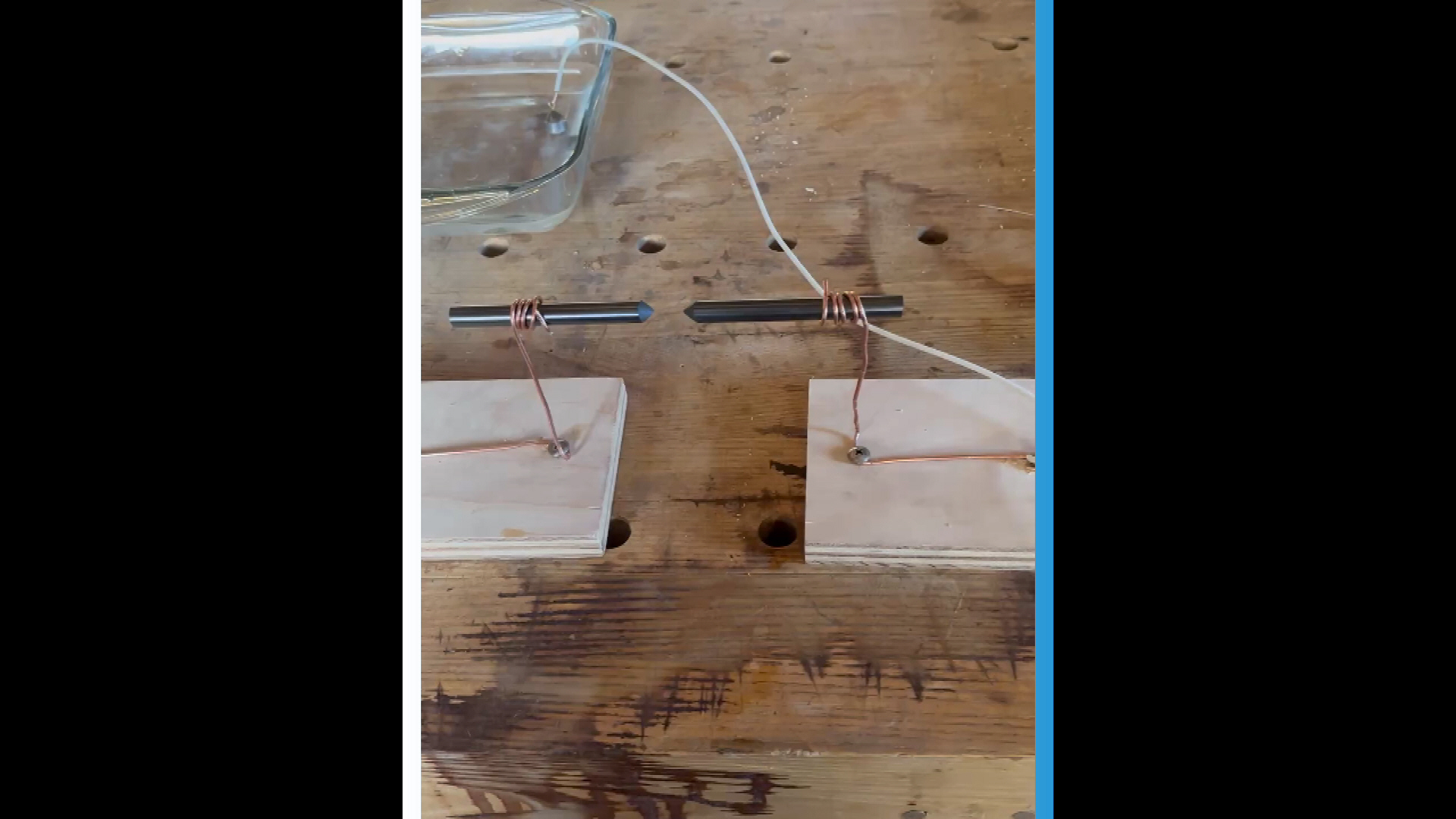 I have reproduced this setup nearly identical to the one my brothers and I made 50+ years ago in the basement of our home. We scavenged the carbon rods from the center of D size carbon zinc batteries (not as ubiquitous as they once were). To keep from producing a short circuit and blowing a fuse, we lowered the voltage using a salt water rheostat which consisted of a couple of wires attached to large lead fishing sinkers suspended in a bowl of salted water. Moving the sinkers closer or farther apart adjusted the voltage. After continued use the water gets almost to boiling point because of the current being diffused.